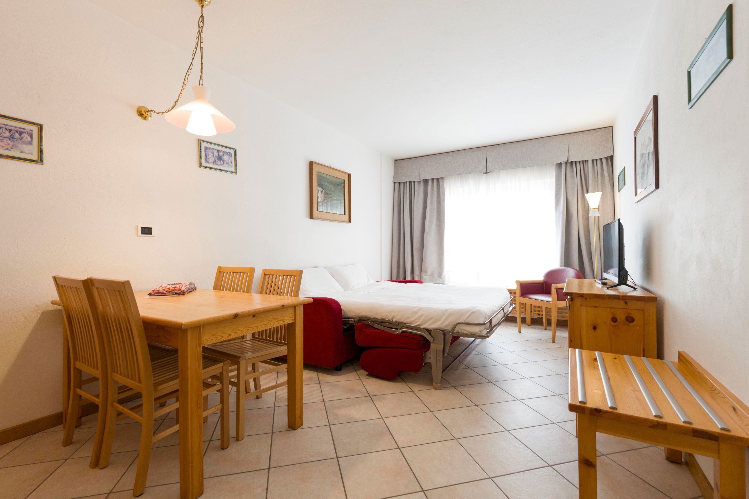 Accogliente e funzionale appartamento composto da soggiorno con TV e divano letto matrimoniale, angolo cottura attrezzato con piastre a induzione o elettriche, forno a microonde e lavastoviglie, e bagno con doccia.
