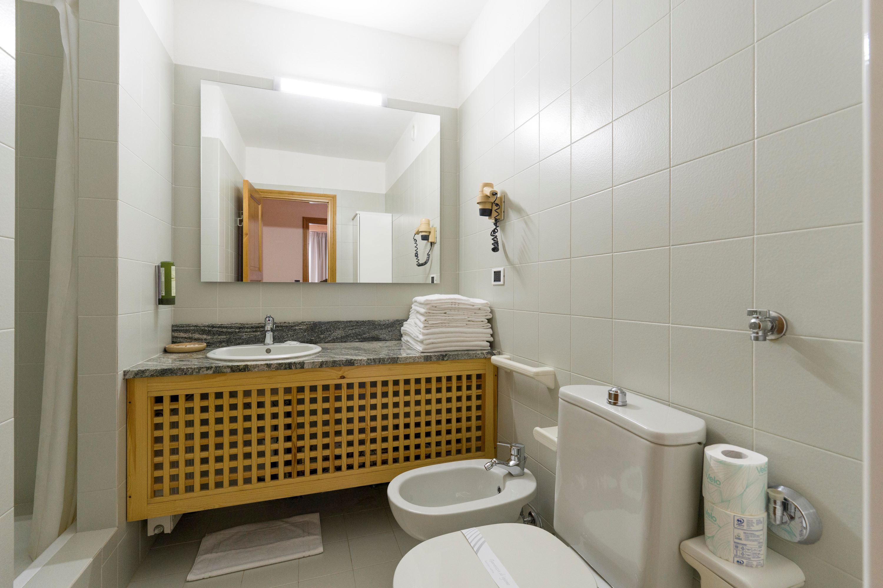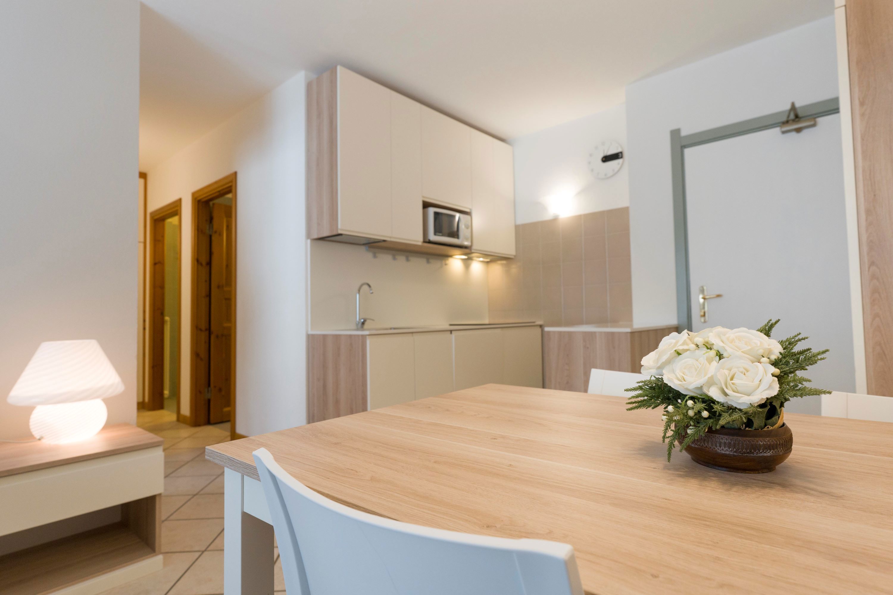 Ampio e confortevole appartamento composto da soggiorno con TV, angolo cottura completamente attrezzato con piastre elettriche, forno a microonde e lavastoviglie, e bagno con doccia.